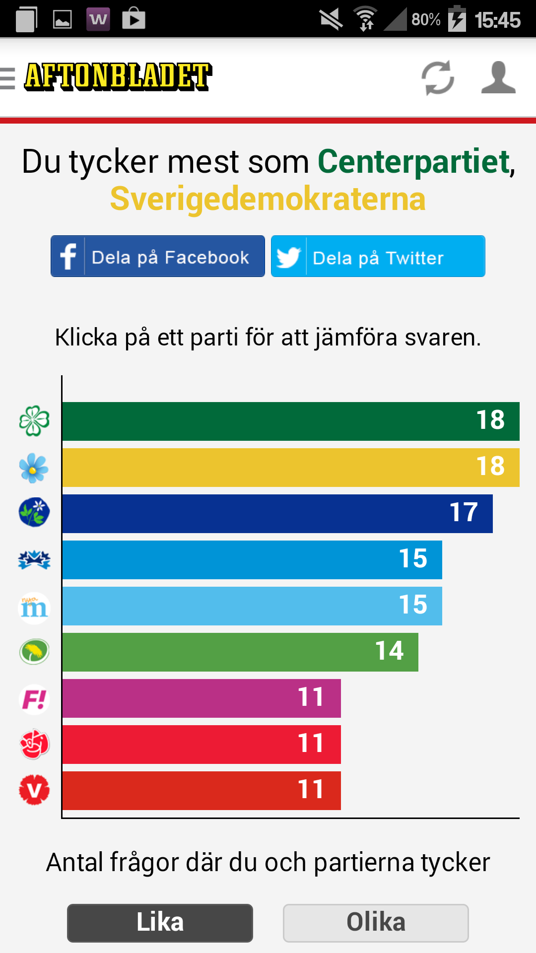 Valet i september 21 juli 201421 juli 2014Penardun Aftonbladet, Personligt Etiketter:Röstning, Riksdagsvalet 2014 Har fortfarande inte bestämt mej, men jag kommer att rösta. Gjorde ett test på Aftonbladet. Tror inte det stämmer någe vidare. Centern? Eh… Nope… Vill du verkligen dela? Tjohoo! Tryck: Klicka för att e-posta en länk till en vän (Öppnas i ett nytt fönster) E-post Dela på TumblrMerTweet Klicka för utskrift (Öppnas i ett nytt fönster) Skriv ut Klicka för att dela på Reddit (Öppnas i ett nytt fönster) Reddit PocketGilla Laddar in … Relaterade