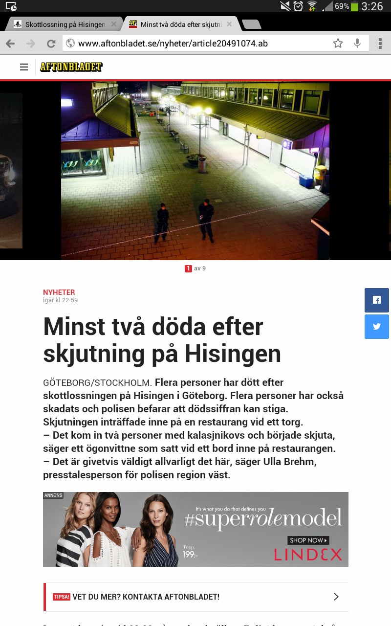 Var inne i stan och såg en massa polisbilar köra åt vårt håll. Hoppade av vid torget strax efter kl. 23 och då stod det ett gäng polisbilar utanför vårdcentralen. Vi visste då inte vad som hade hänt. Googlade på nyheter när vi säg poliserna först, ca kl. 22.35, men då hade inget kommit upp ännu. Vi hade känt brandlukt när vi tog vagnen från torget vid strax innan 22. Det hade tydligen varit ett par bilbränder i området precis innan. Larmet hade tydligen kommit in kl. 22.23.