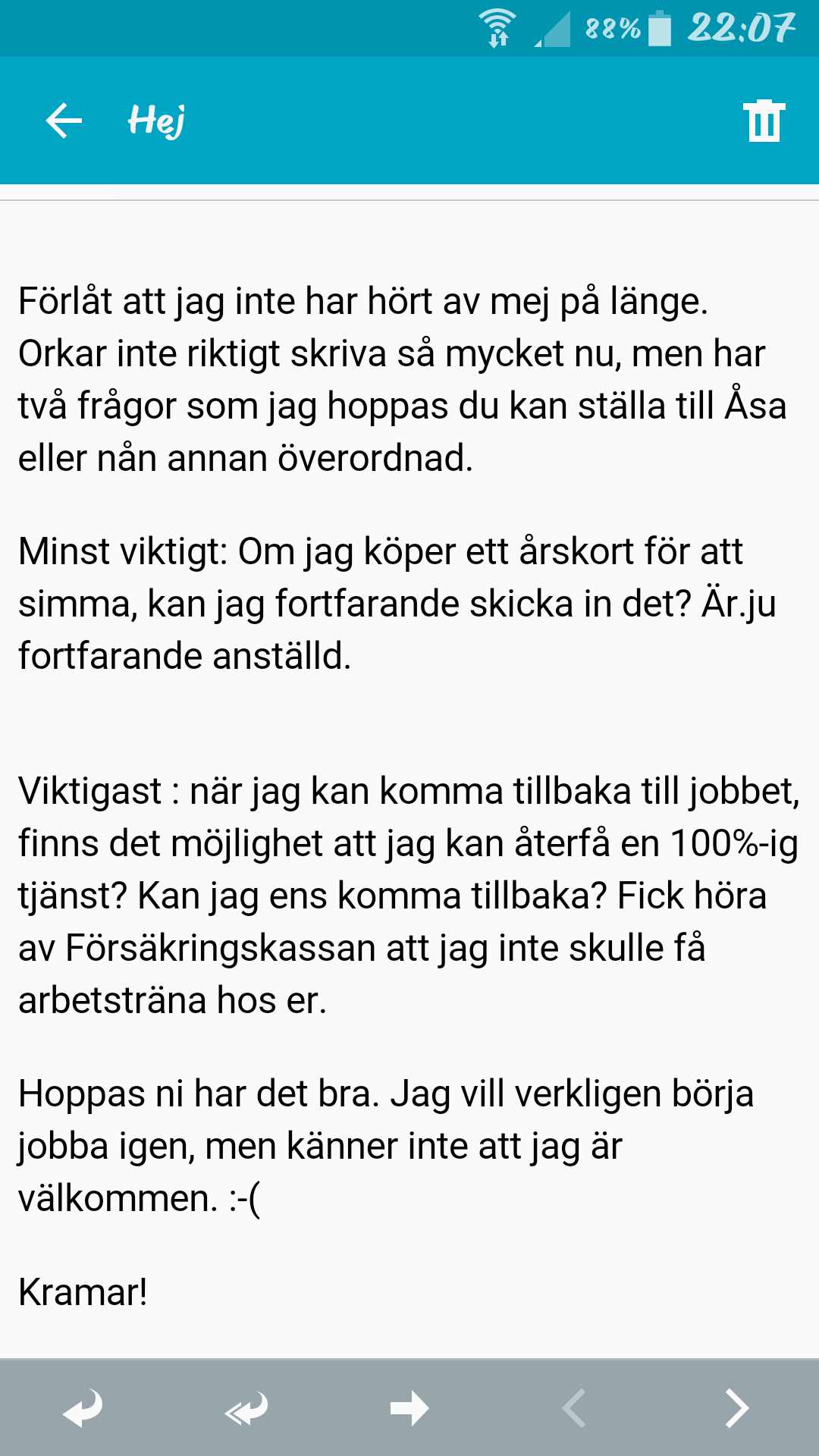 Har börjat må bättre på Voxra. Drömmer om och har mardrömmar om jobbet. Vill återgå till normalitet.. Messade arbetskollega idag.