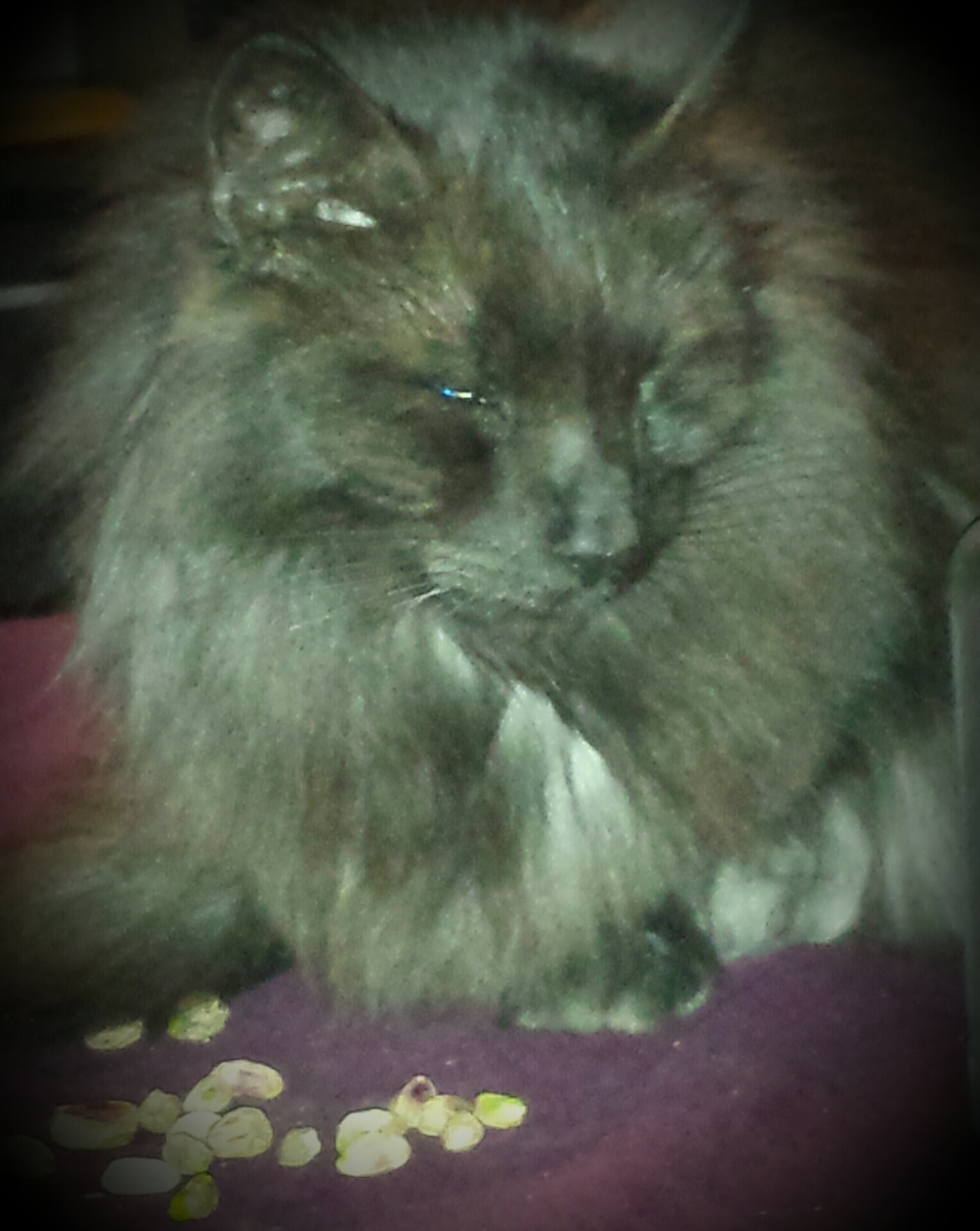 Gamla gubben har ALDRIG ätit någon ”människoföda”, men idag sätter han plötsligt i sej flera skalade pistagenötter (kanske fem stycken), som låg kvar på bordet. Jag är helt chockad.