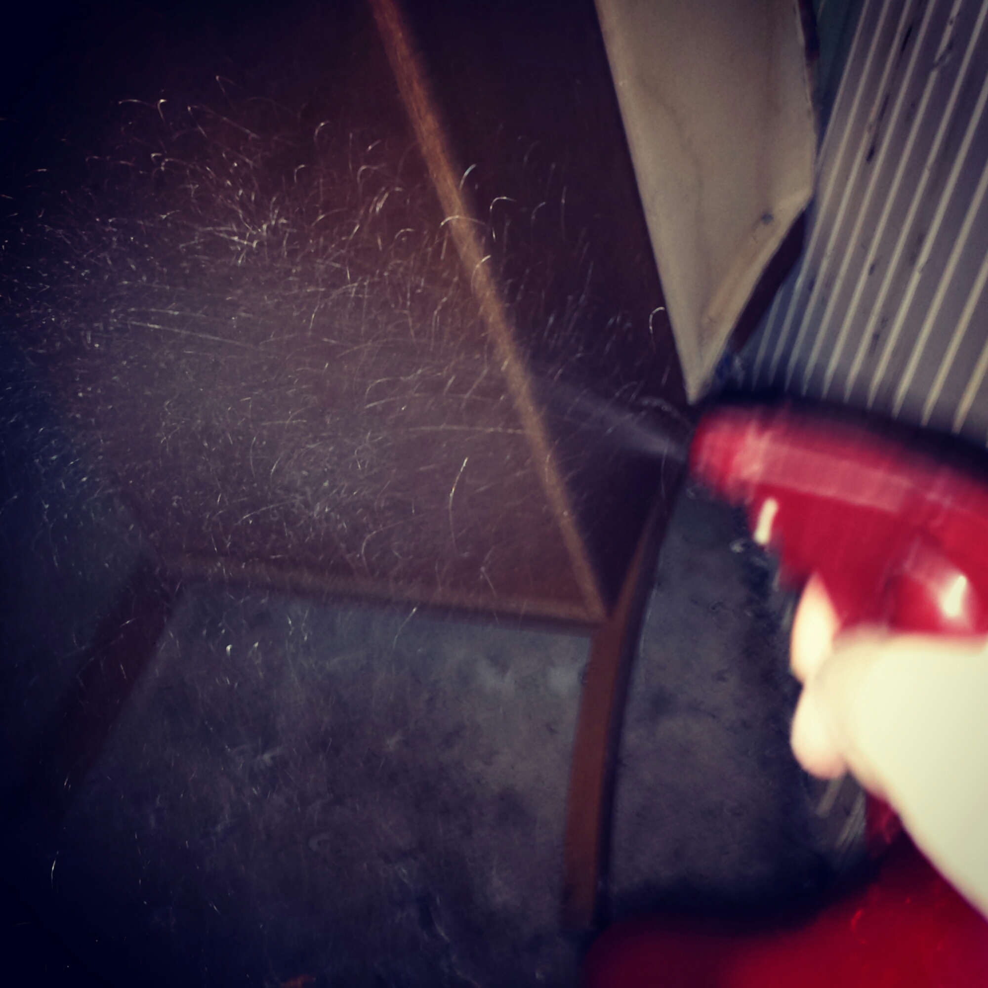 Blandade vinäger, citron, olja och vatten i sprayflaskan. Sprejade över allt på balkongen (golv, bänk, galler). Försökte sätta upp gallret så gått det gick med snören, måste köpa nytt och häfta fast ordentligt.