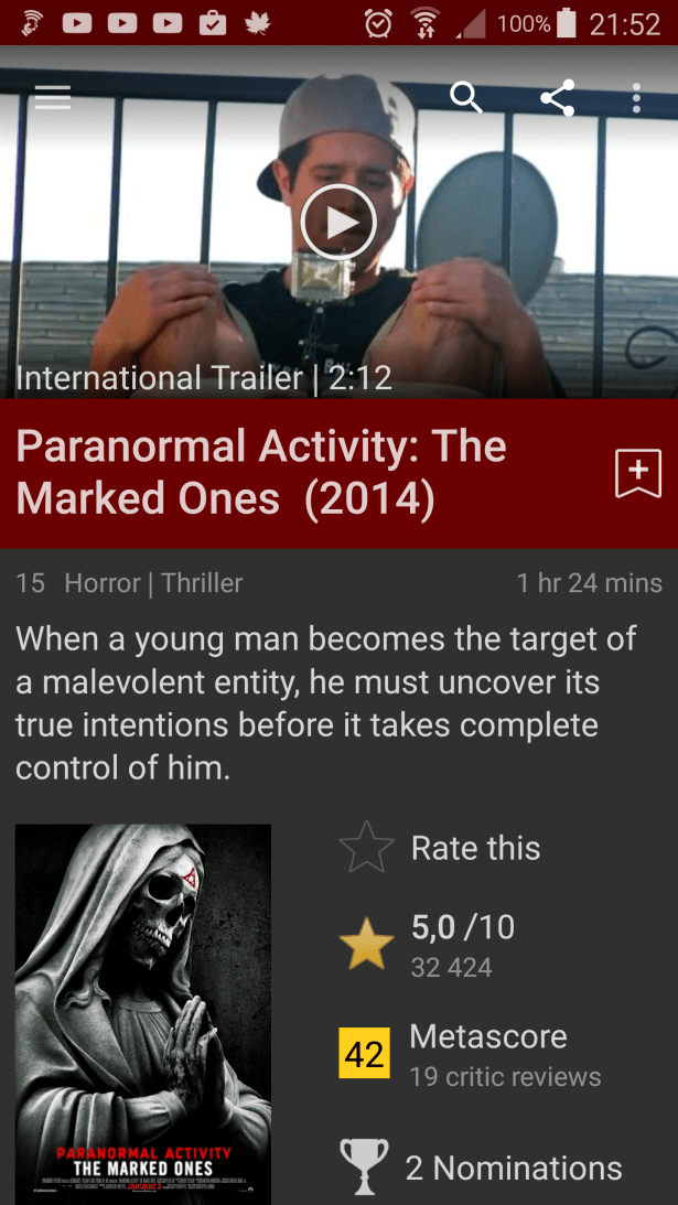 ”Paranormal Activity: The Marked Ones” (2014). Femte delen, tror jag. Har nog bara missat nån, men de har verkligen bara blivit sämre och sämre (inte för att någon skulle bli förvånad av detta faktum). Inte vidare läskig var den heller.