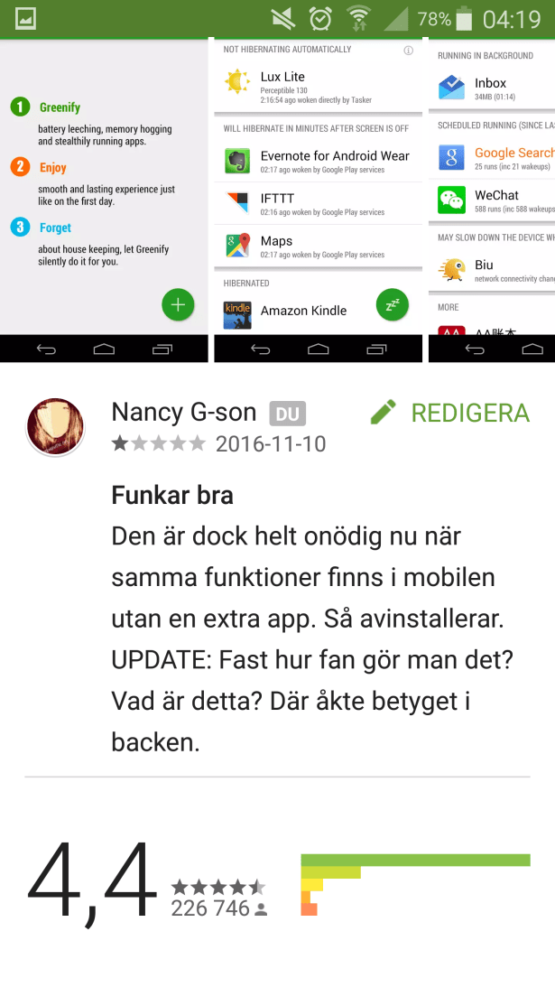 Avinstallerar ”Greenify” i alla fall, den är helt meningslös.