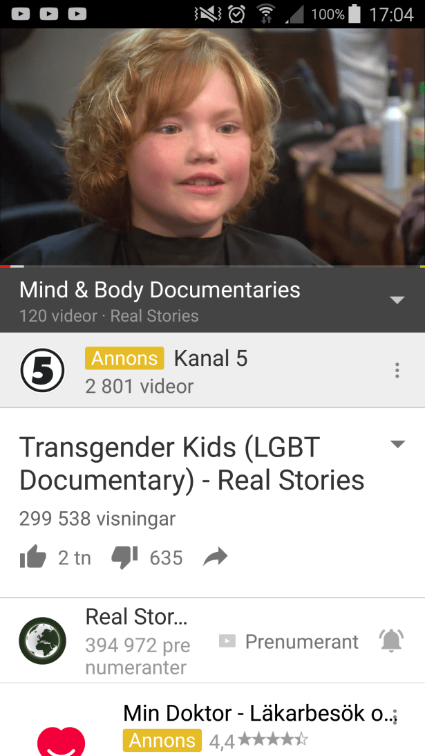 Detta är (liksom ovan) en sån sak som man (jag) har svårt att greppa. Det är barn som så tidigt i livet har insett att de har blivit födda i fel kön och börjar leva som det andra könet. Jag har hört talas (läst nån artikel) om det, men visste inte att så unga kan få börja med hormonbehandling och därmed påbörja övergången till sitt rätta kön. Jag kan verkligen inte förstå hur de känner eller sätta mej in i deras situation, däremot har jag inga problem med det. Varför skulle man? Alla borde få leva och uttrycka sej precis hur fan man vill.