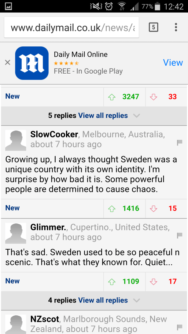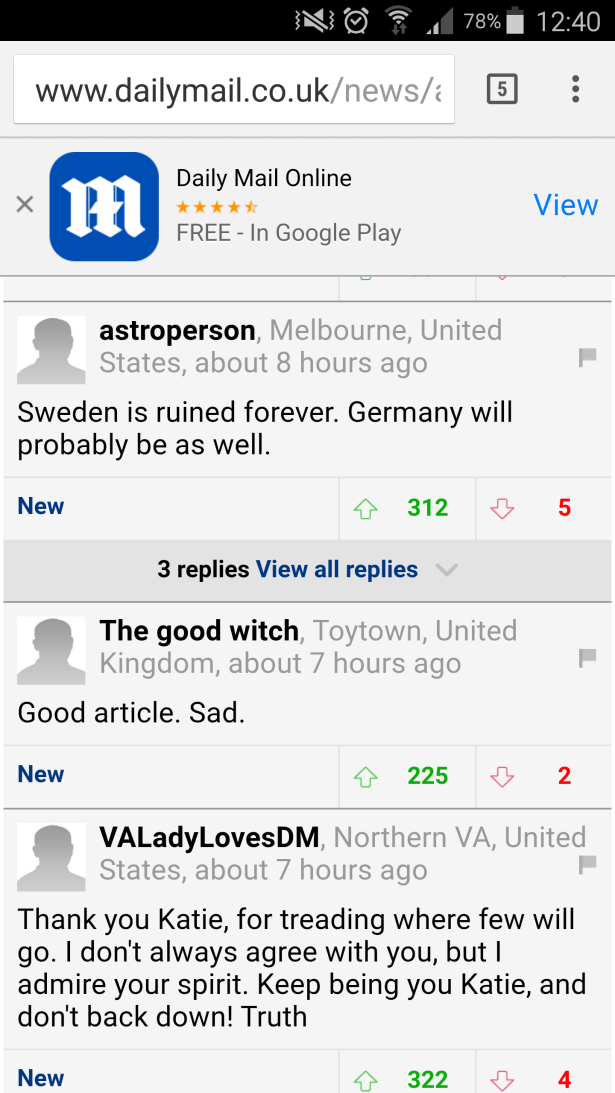Så mycket bullshit i kommentarsfältet. Läste inte alla 949 kommentarer, så klart, men kanske 300, och av dessa var 98 % skrivna av britter (och även en del och annan amerikan). Detta är alltså britter, som uttalar sej, med säkerhet, om att det är så här situationen ser ut i Sverige. Har de ens varit här? Vem vet (troligtvis inte). Någon enstaka ser nyktert på reportaget, men blir snabbt nedröstade. Tror jag såg två svenskar som skrivit, båda kvinnor, varav en höll med Hopkins och en inte.