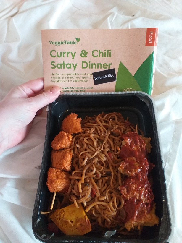 Lunch: Curry & Chili Satay Dinner av VeggieTable. God. 1208 kcal. Jag åt bara några av bullarna.
