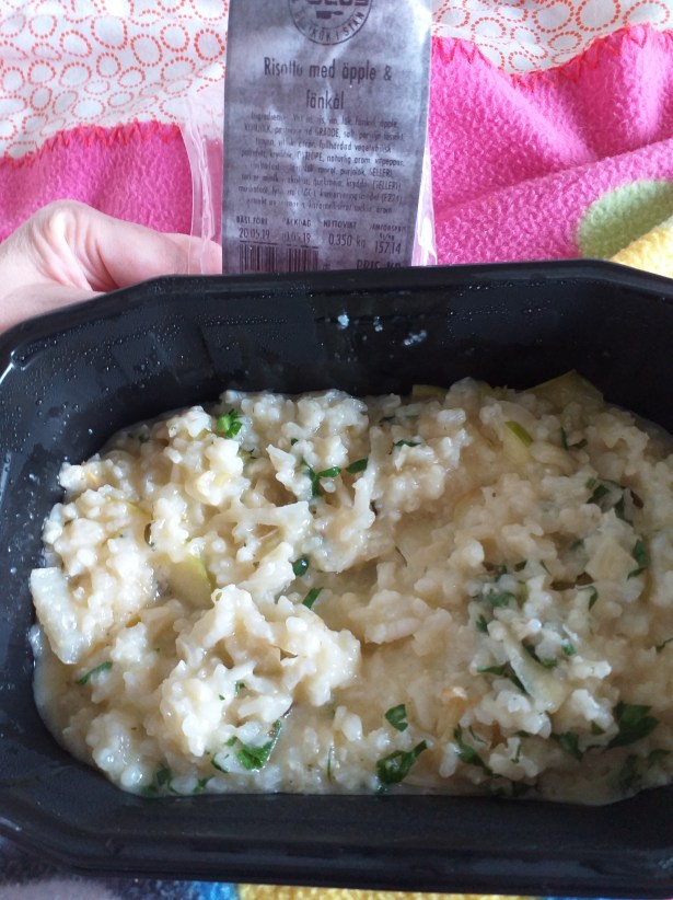 Lunch: Risotto med äpple och fänkål av ICA Fokus. Riktigt god. Vet ej kcal, men kanske 600.
