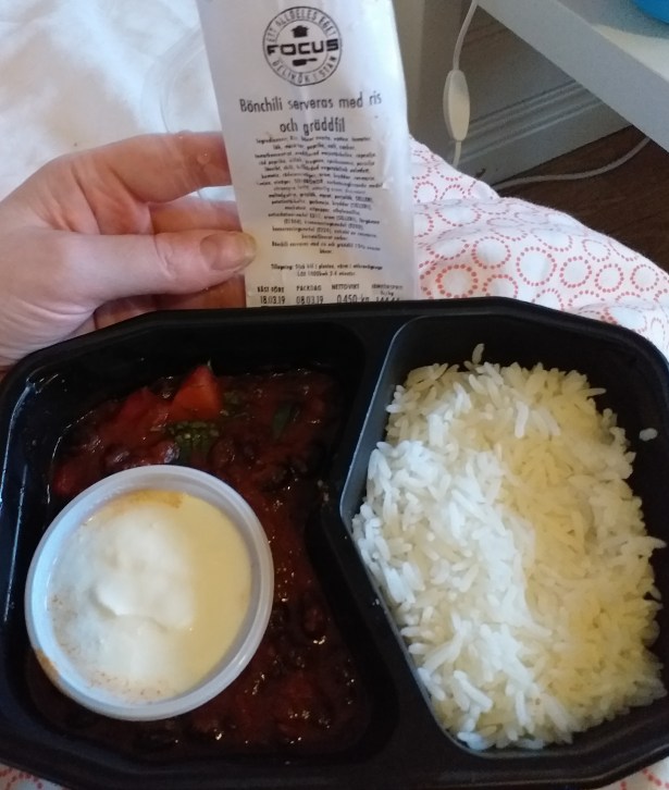 Bönchili med ris och gräddfil från ICA Fokus. Mycket god. Runt 700 kcal kanske.