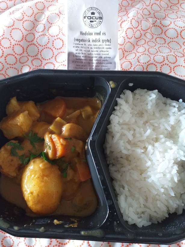 Vindaloo med ris från ICA Fokus. Helt ok. 600 kcal.
