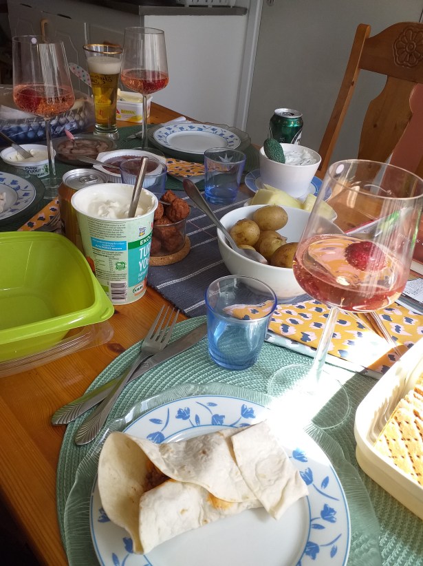 Lunch: Midsommarmat + cider + äppelpaj och vaniljsås. 1000 kcal.