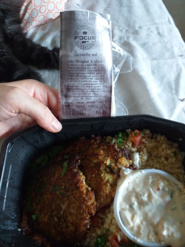 Zucchinibiffar med mynta/chiliyoghurt och tabbouleh från ICA Focus. Skitgött. 700 kcal.