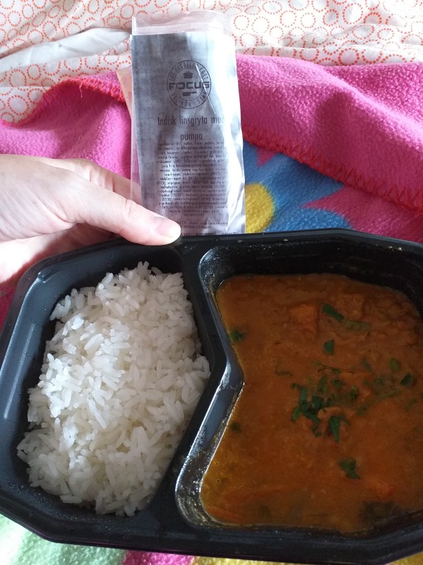 Indisk linsgryta med pumpa. Helt ok. 600 kcal.