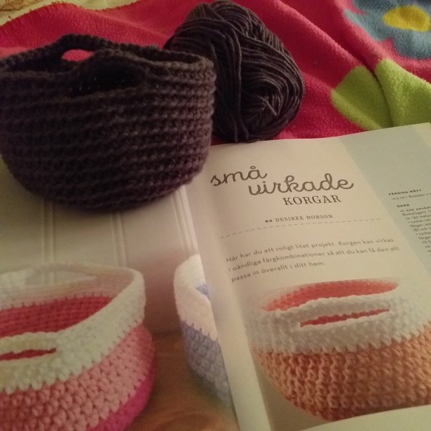 Virkning: inte köpt något garn till filten, så tog lite gammalt garn och gjorde en liten virkad korg på kul (från samma bok). Den blev rätt liten, så repade upp en bit. Tänkte göra som en liten korg färdigpackad med mobil, plånbok, busskort, nycklar och cigg som jag låser in i det lilla miniskåpet på badhuset, de närmaste fyra veckorna tills omklädningsrummet och innebassängen har öppnat igen.