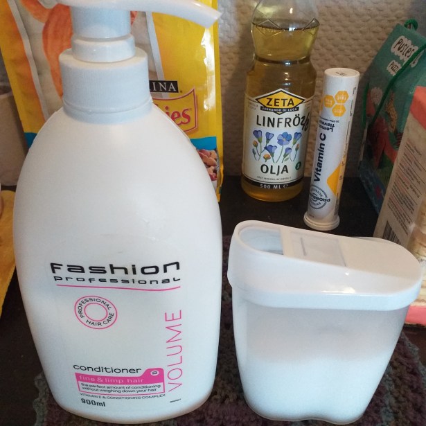 Tog en sväng förbi Backaplan. Köpte en balsam som var billig (900 mL för 30 spänn), men var tvungen att köpa en liten förvaringsburk för att kunna ha med mej i necessären till badet.