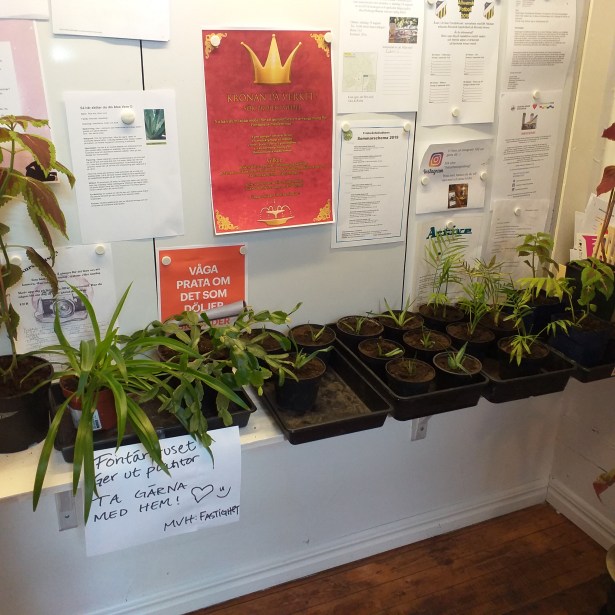På Fontänen blev det inte så mycket socialt idag. Jag lånade deras symaskin och lagade min Snobben-väska som hade gått sönder i ena handtaget. Svarade sedan på mejl medan de andra var och åt. Eftersom jag inte direkt pratat så mycket så gick jag ut med rökarna en sväng innan jag gick därifrån.