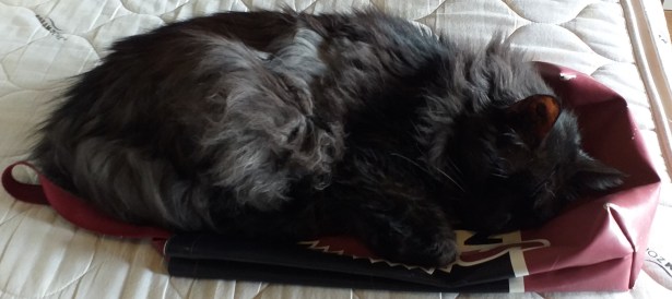 Tvättade väskan och skulle hänga den på tork, men det tyckte inte Spike (fick inte bädda heller).