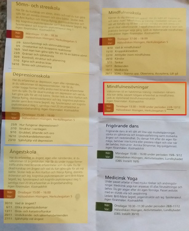 Det är föreläsningar (samtal?) om flera ämnen som är relevanta för mej: Sömn & Stress, Depression, Ångest och Mindfulness. Det som började först var en halvtimmes mindfulness-övning i grupp, så, efter att ha varit otroligt nervös och uppstressad och t.o.m. tagit medicinen, lyckades jag ta mej iväg. Jag blev bara orolig av att sitta och vänta (det började först kl. 13.30), så jag åt lunch (svårt när nervös) och tog en långpromenad till en hållplats på vägen. Väl framme vid Hjalmar Brantingsplatsen var jag fortfarande tidig, så jag gick till apoteket och tog en kortare promenad. Övningen gick bra. De var trevliga, presenterade sej och förklarade vad som skulle ske. Pratade med två av de andra besökarna, som var trevliga. Det var kanske femton personer sammanlagt. Vi kunde ligga eller sitta på liggunderlag på golvet. Fanns även stolar. Ska ta en stol nästa gång, kändes som jag fick ont i ryggen och nacken när jag satt på golvet, försökte med att luta mej mot väggen men det hjälpte inte. Kände igen övningarna, det var fokus på andningen samt kroppsscanning. Min utmaning var att göra detta i grupp, att besöka ett nytt ställe, träffa okända människor och våga göra något nytt. Även om dessa övningar är de jag gör hemma på egen hand, så kommer jag att fortsätta gå. Mest p.g.a. utmaningarna att passa en tid, befinna mej bland människor och göra något positivt.
