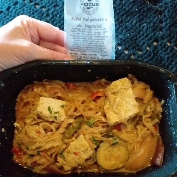 Nudlar med grönsaker i tofu från ICA Focus. Mycket god, men lite blaskig. 600 kcal.