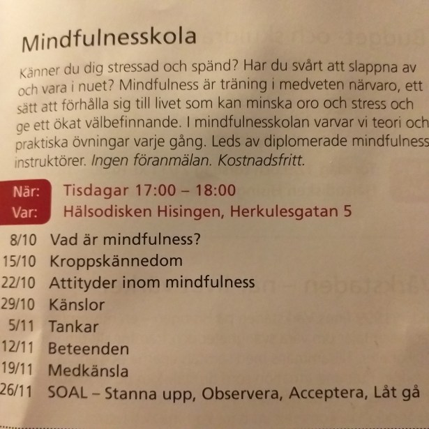 Så om jag orkar med det så blir det tisdag, onsdag och torsdag varje vecka, men det är inget krav att gå varje gång och ingen anmälan, vilket passar mej då det är kravlöst. Det är viktig information och helt klart användbara övningar för mej, så jag vill gärna gå, men det är inte hela världen om jag missar nån gång. Jag hade svårt att ta mej dit med min ostadiga gång, yrsel och oro, men när jag väl satt mej på spårvagnen gick det bra. Slappnade inte riktigt av, men en andningsövning vi gjorde hjälpte lite. Intressant föreläsning var det i alla fall och jag känner mej tacksam att jag kom iväg. Eftersom jag inte hade gått mina steg i dag så gick jag av vid Brunnsparken och gick resten av vägen. Kollat på ”Brottsjournalen” och ska nu sova, trött av all stress idag.