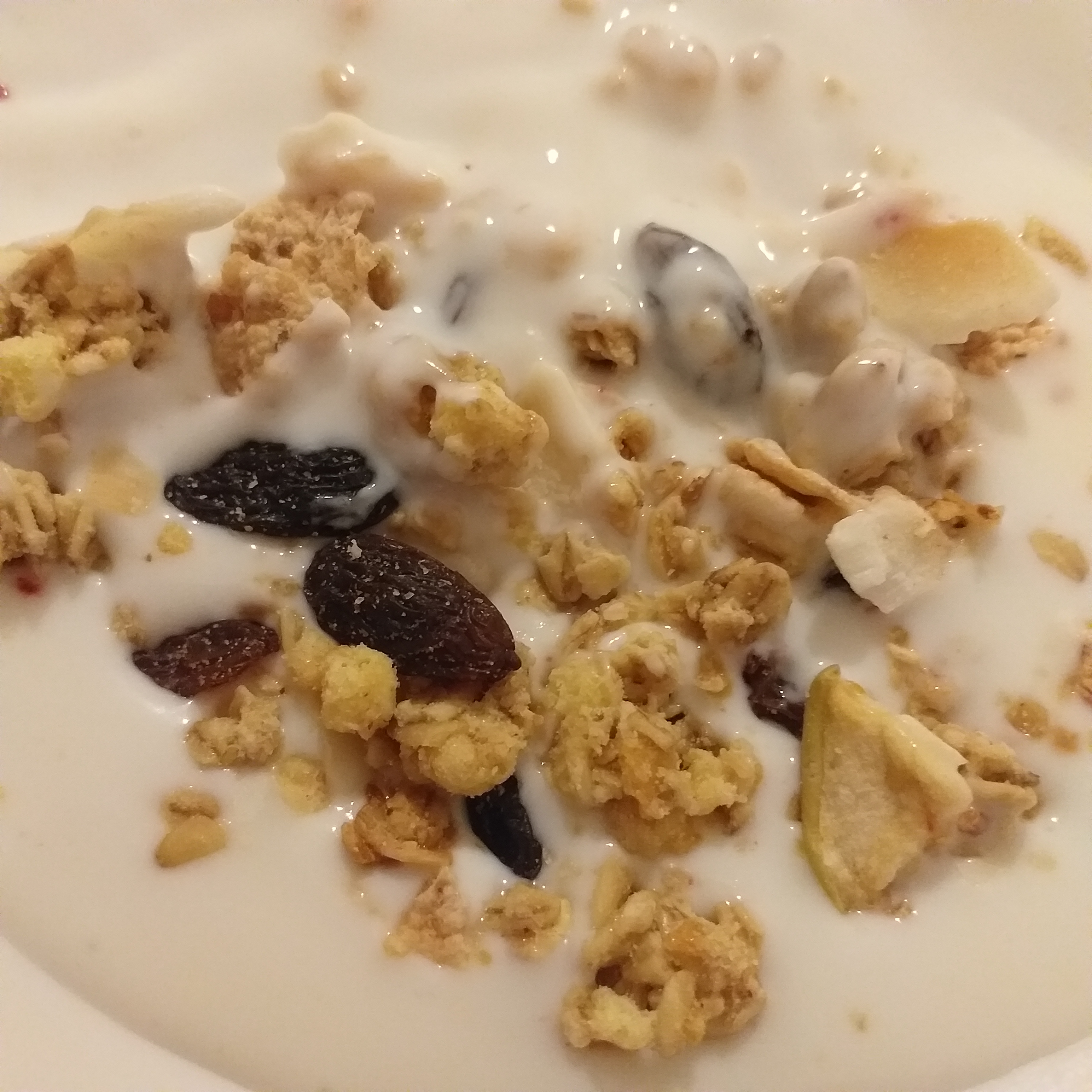 Kvällsmat: Fil och fruktmüsli. 176 kcal.