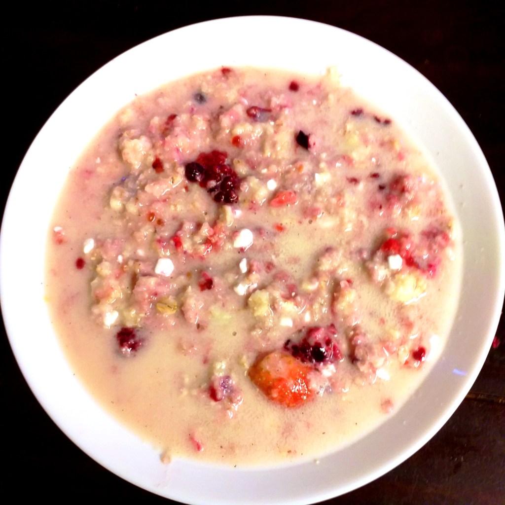 Frukost: Linfröolja, C-vitamin, Havregrynsgröt med havredryck, keso, fröblandning, torkad frukt och blandade frysta bär. 470 kcal.