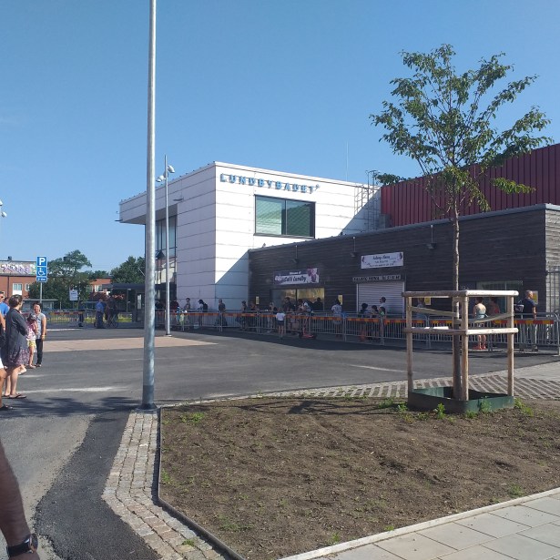 Kön till Lundbybadet en fredag förmiddag innan dörren öppnas kl. 10 (ser alltid ut så här vid sol). Denna gång räknade jag till 87 st före mej (enligt corona-regler är 100 st max). Antingen hade jag räknat fel (kan ha glömt några barn) eller så var den kommande simskolan inräknad, men precis vid mej var det fullt. Fan. Väntade en kvart till 10.45, men hade tvätten på tork i tvättstugan och även om någon hade snabbsimmat, så gav jag upp.
