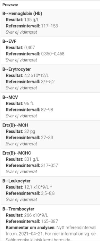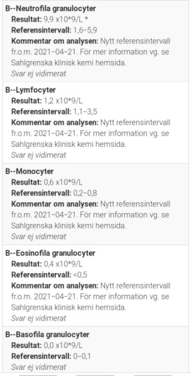 Jag vet, jag är BMA och borde veta allt detta, men nä, det borde jag inte, det är det doktorn är till för, vi gör det praktiska och tekniska för att få fram provsvaret. Jag har den övergripande insikten om vilka prover som tas och varför, men inget mer. Mina avvikande provsvar var förhöjda leukocyter, vilket brukar tyda på en pågående infektion. Just förhöjda neutrofila granulocyter (den vanligaste, normala typen av leukocyt) borde väl vara helt ok? Ska googla på det. Det var dock inga extrema förhöjningar så jag tror inte att läkaren ens kommer att höja på ögonbrynen.