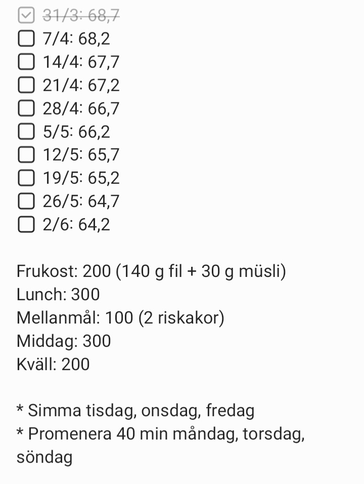 Fick inse att jag inte hinner gå ner mer än max fyra kilo med tanke på vad jag väger nu, men det känns okej. Jag kan nöja mej med 64 kg och jag kan faktiskt fortsätta att gå ner efter att jag har nått det målet.