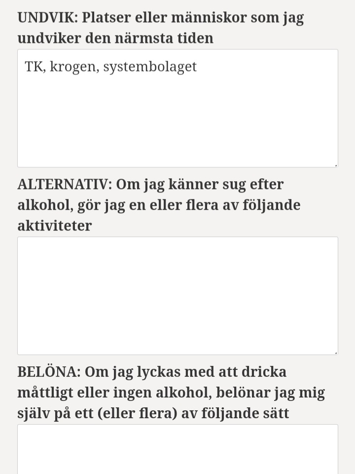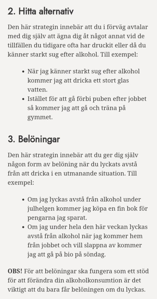 Fortsatte med Alkoholhjälpen efter matchen. Känns lite fel att samtidigt sitta med en folköl i handen, men jag dricker inte starköl och jag försöker verkligen nu. Skulle fundera på vad jag bör undvika, samt alternativ och belöning.