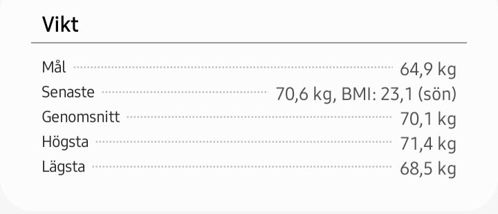 Jag har fan, svårt att komma på något. Jag är skittråkig, men jag hade velat ha åkt till USA. Snäll, för det är så jag lever mitt liv. Matlagning. Spaghetti med tomatsås och svarta bönor. 97 kcal/100 g. Fy, vad hemskt. Enligt översikten för förra veckan (i Samsung Health-appen) låg min genomsnittliga vikt över 70 kg!! Köpte fil för mina ”sista” pengar (har fortfarande 70 spänn kvar till ett ciggpaket…), så att jag kunde hålla ner kalorierna. Ligger på 800 kcal nu, för idag (har satt det som max). Hetsätningen triggas av matbristen, så jag får verkligen se till att jag inte blir hungrig!