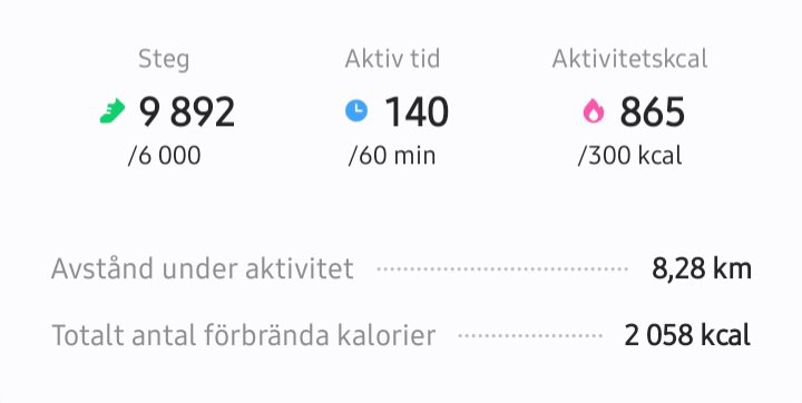 Vikt: 68,5 kg (samma som igår efter samma ansträngning som dagen innan, då jag gick ner 0,7 kg)