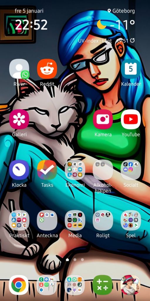 Eftersom jag inte har blått hår längre, så ville jag ha en ny bakgrund på mobilen, så jag skrev ”48 year old woman with brown hair with one ragdoll cat”. Inte hittat rätt bild att byta bakgrunden med ännu.