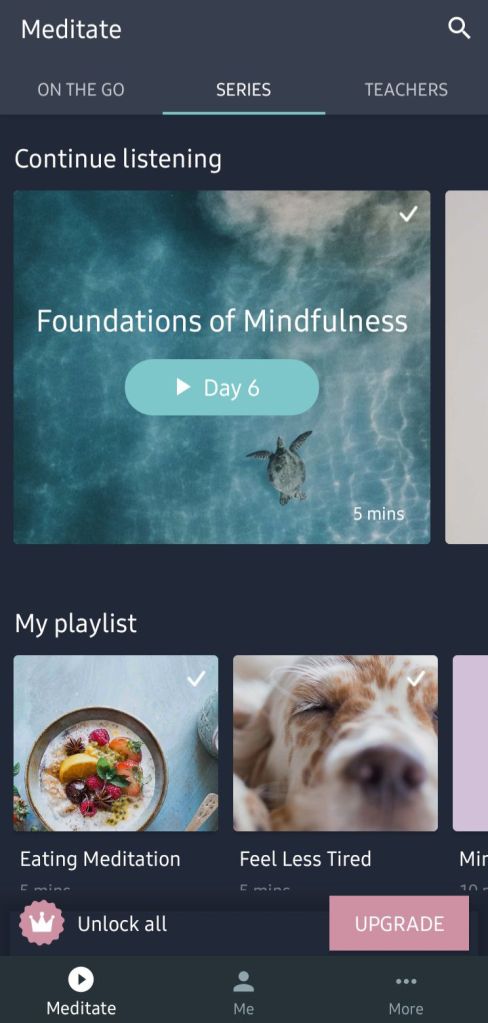 Den här veckan kör jag ”Foundations of Mindfulness”, som är riktigt bra. Just dagens övning var att fokusera på andningen och när en tanke kom så skulle man benämna den ”tänker” eller ”minns” eller ”planerar”. Just planerar gör jag oabrutet i hjärnan – jämt! Det stressar mej enormt. Om jag kan lära mej att benämna dom tankarna, släppa planeringen och fokusera på andningen varje gång, så tror jag att det verkligen skulle hjälpa mej att slappna av. Jag ska ha det i åtanke dagligen.