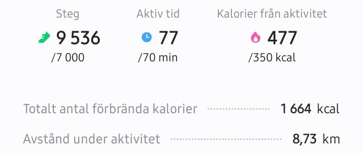 Uppe vid strax efter kl. 11. Lyckades ta mej ut på en promenad vid kl. 13. Var väldigt stel och gick väldigt långsamt, men höll mej ändå ute i 70 minuter.