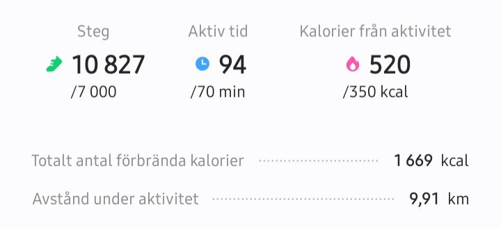 Vikt: 64,7 (-6,3) [åt ca. 1000 kcal, förbrände ca. 1900 kcal, -1,2!]