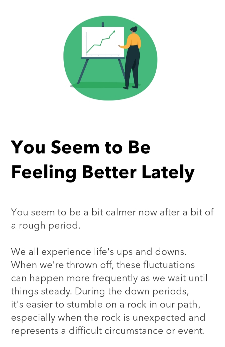 Apropå något annat: använder ju fortfarande Minddoc för att få översikt över mitt mående och i förrgår fick jag resultatet för de senaste två veckorna: