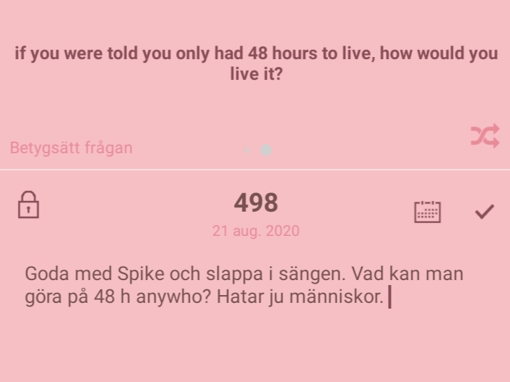 Har en app som heter ”Frågedagboken”. Har ingen aning hur det kommer sej att jag tog hem den (över två år sen), men kl. 20 varje dag svarar jag på en fråga som får mej att reflektera lite över mitt liv.