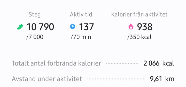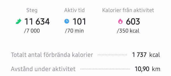 Vägde 67,5 kg idag, så minus 0,5 kg. Kollade appen och jag förbrände 1972 kcal och åt 1093 kcal igår. Idag har jag ätit 1063 kcal, får se imorgon vad förbränningen blir.