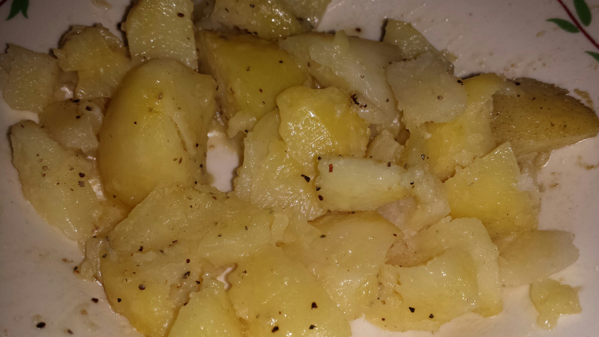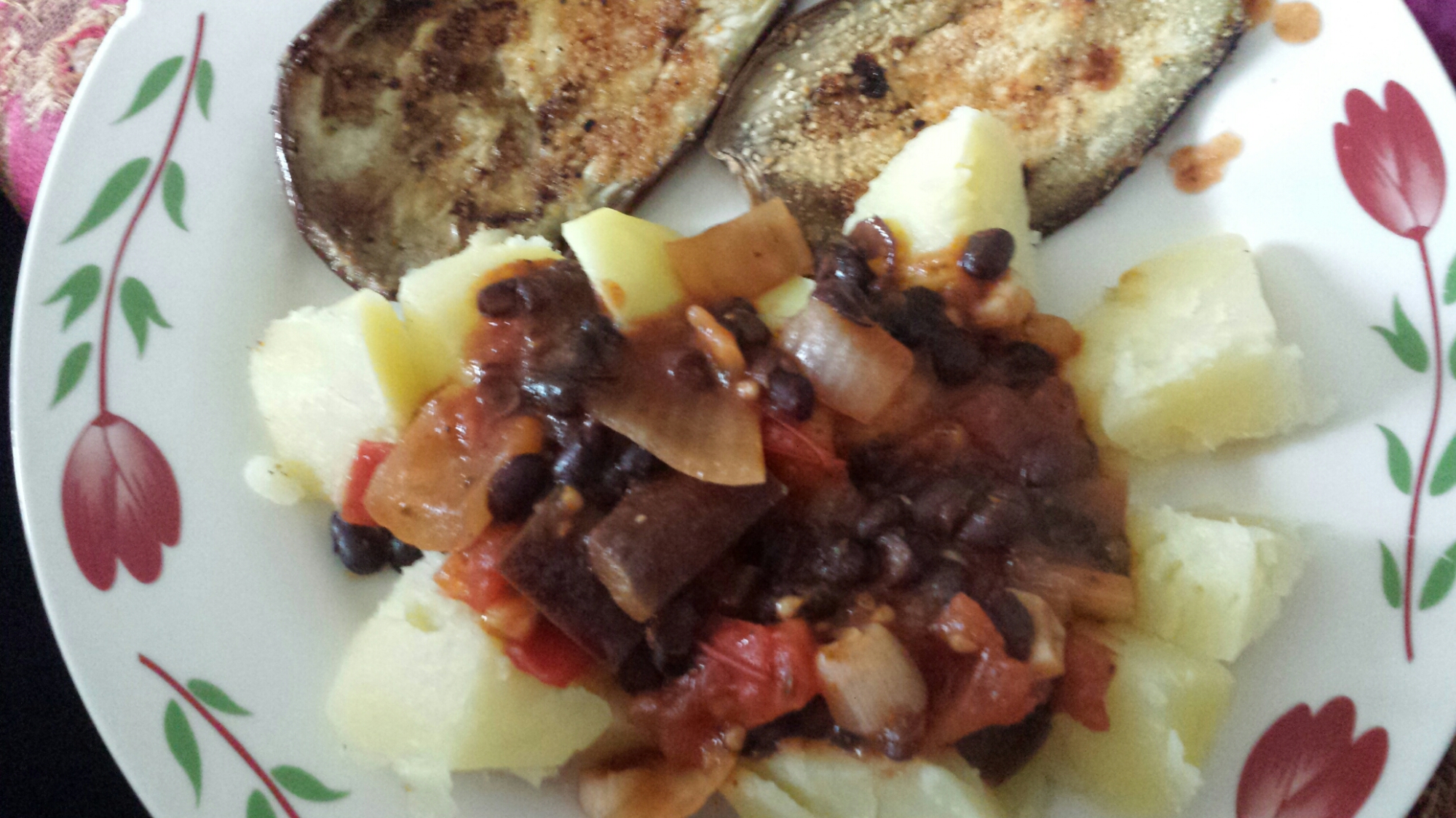 Lagade böngryta med stekt aubergine och kokt potatis. Inte helt kalorifritt, men, men… Mat måste man ju äta.