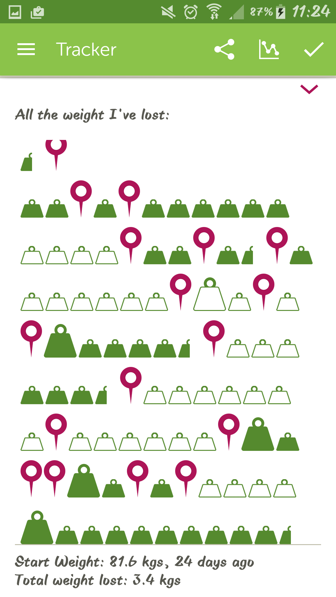 Vad fan! Jag kan inte klura ut hur jag ska få ut något av dessa ”vikter”, eller vad det nu ska föreställa. Vore mycket bättre om det bara stod total vikt sen start och hur mycket man gått ner sedan föregående vägning. Eller?