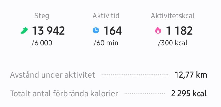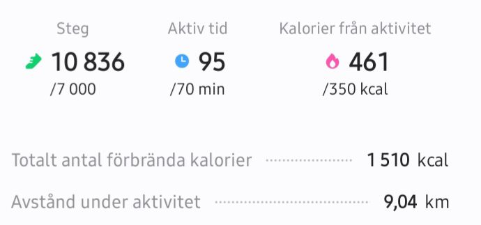 På väg hem från Lidl passade jag på att gå min promenad. Blev 34 minuter och har idag gått 8.500 steg (7,6 km) och 121 aktiva minuter. Har ökat mina mål till att jag ska gå minst 4.000 steg, ha 70 aktiva minuter och förbränna minst 500 kcal per dag.