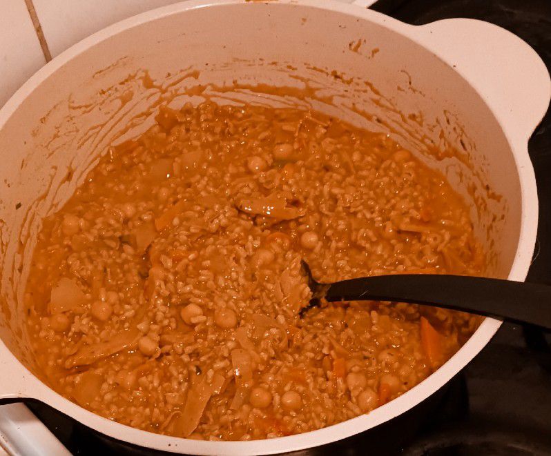 Blev en massa portioner! Havreris med kokosmjölk och oumph. (110 kcal/100 g). Har inte smakat på den än, men Rhith sa att det var ok. Gått långt idag.