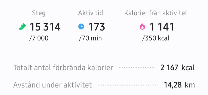 Vikt: 64,1 (-6,9) [åt ca. 1000 kcal, förbrände ca. 2100 kcal, -0,6]
