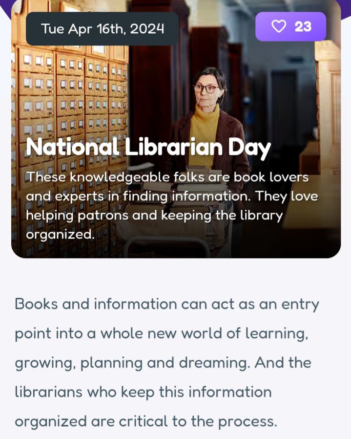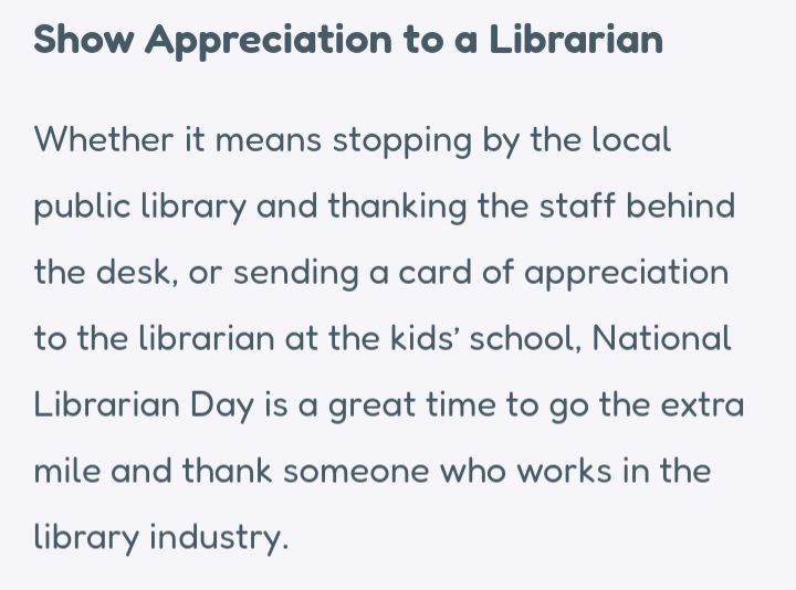 Gick fram till två bibliotekarier som stod och pratade och frågade om dom var just det. Visade mobilen att jag hade upptäckt att det var deras dag idag. Sa ”så jag vill bara tacka er för att ni finns”. Dom blev jätteglada och förvånade. Dom tackade mej så gott sa ”tack för att du finns”. Dagens goda gärning, kändes bra.