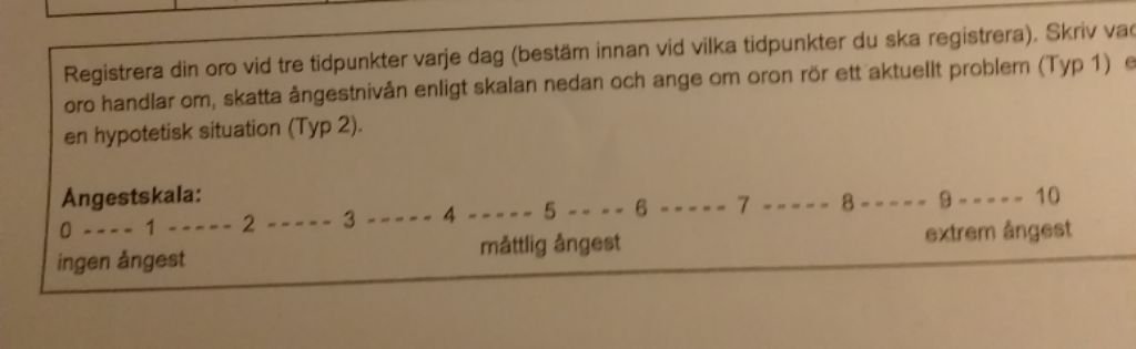 Ångestdagbok/oroslista, koncentrationen: har bara börjat titta på det ena pappret (orosdagboken) som kuratorn skickade. Ska börja fylla i det imorgon.