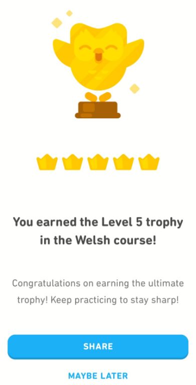 Är helt klar med walesiskan på Duolingo nu, men jag kommer att fortsätta använda appen för att öva. Sen får jag gå över till typ barnböcker.