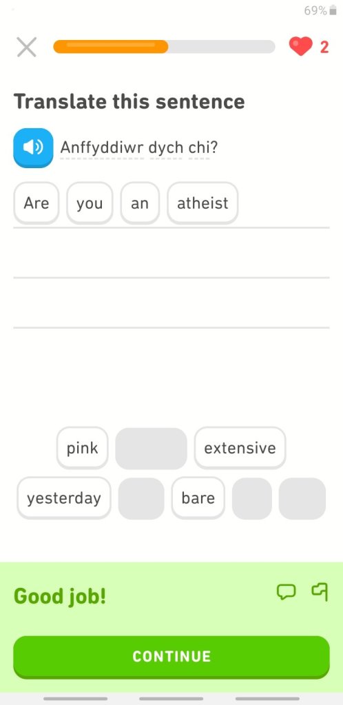 Finns 15 avsnitt.Fan, min nagel har gått av. Vad ska jag göra åt det här (kan ju inte dra av nageln så långt ner – aaargh)Årlig sammanfattning på Duolingo (jag började förresten att lära mej walesiska i mars 2019).Senaste virkade mössan (jag är nöjd). Jag vet att jag inte ser klok ut på bilden…Har äntligen kopplat in Wii:et (fick arslet ur vagnen vid kl. 23…) Fast det är nåt fel på färgerna (orkar dock inte kolla upp det nu). Jag är ändå extremt glad över att jag lyckades med hela grejen (plocka fram och dra sladdar, koppla sladdar rätt och få det att funka!) Jag vet att detta låter trivialt för dom flesta (speciellt för en tekniknörd) men depressionens grepp om hjärnan har fortfarande inte släppt. Alla såna här ”små” hurdles jag hoppar över ger mej positiv feedback och en push framåt, hur banala uppgifterna än låter. Jag kan faktiskt visa mej själv uppskattning inland!