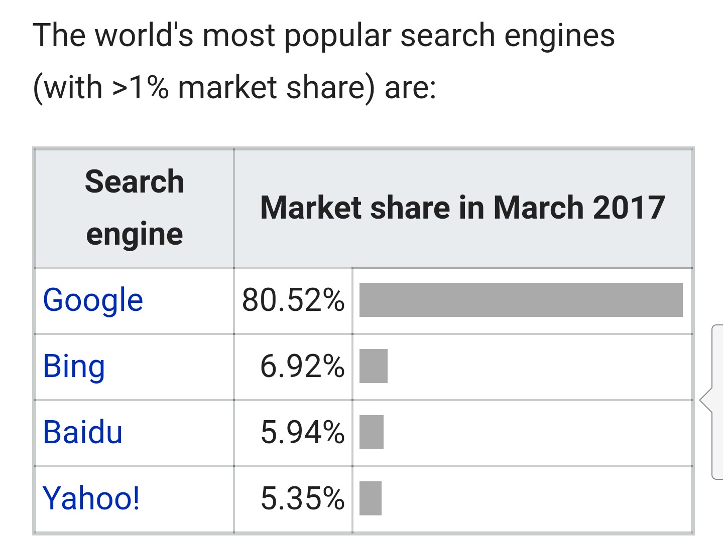 Antar att Baidu är Kinas sökmotor. Bing används väl bara av folk som råkat installera deras search bar och medföljande reklam (teknidioter mao), så min slutsats blir att Yahoo får ”pityvotes” (pitysearches?) och har gamla överhängare som är på utdöende.