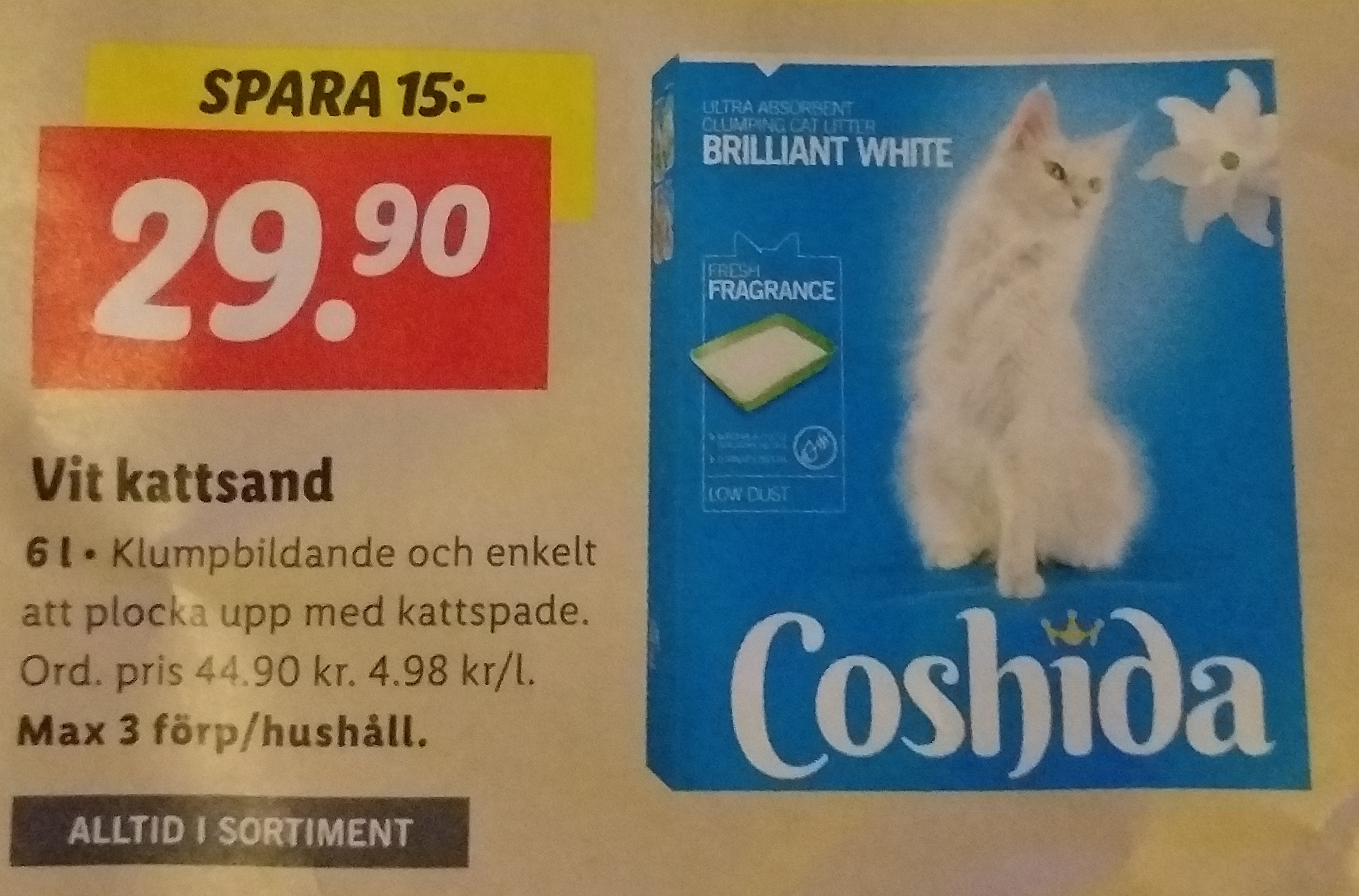 1: Coshida Cat Litter Clumping 10 L Lidl 44,90 kr (4,49 kr/L)