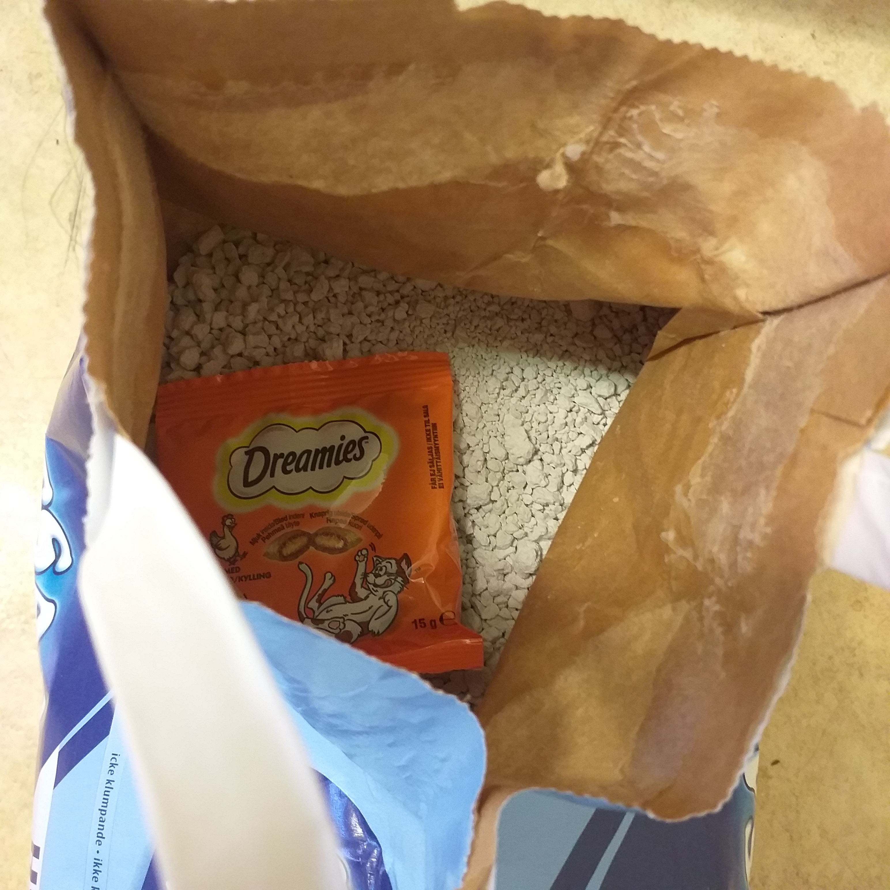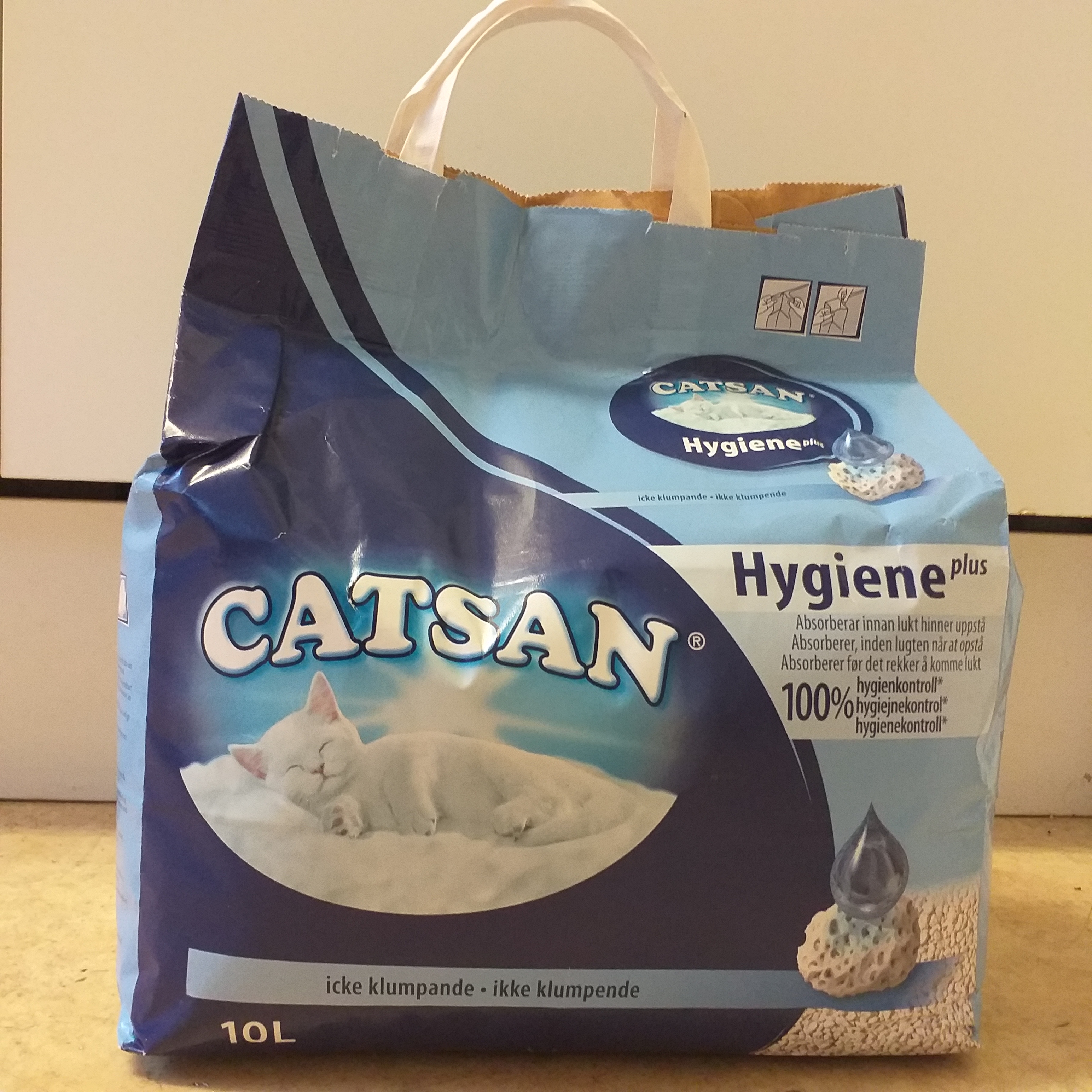 Catsan Hygiene Plus, icke klumpbildande 10 L. Köpt på ÖoB för 69 kr (6,90 kr/L). Innehöll en liten påse kattgodis, som Spike snabbt slukade.